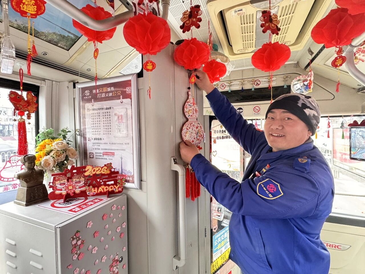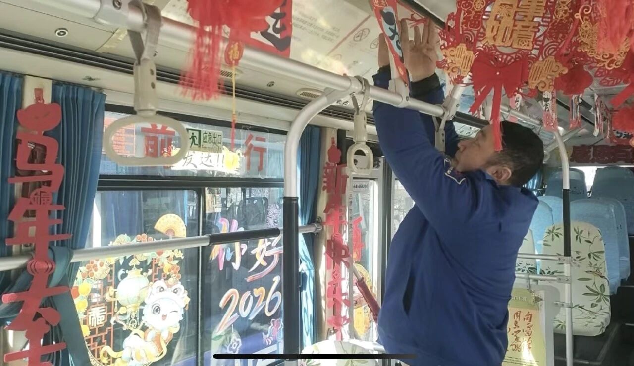 客運集團近期組織對所屬線路運營車輛進行徹底清掃與精心裝飾。車窗上貼起福字窗花,車廂內(nèi)懸掛起紅彤彤的小燈籠,扶手欄上點綴著新春飾物,一輛輛公交車煥然一新。整潔明亮的車廂與喜慶祥和的裝飾交相輝映,使乘客一上車便能沉浸于歡樂的節(jié)日氛圍之中,開啟一段充滿年味的行程。