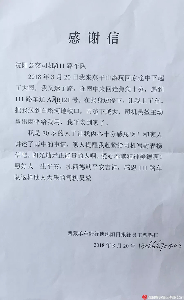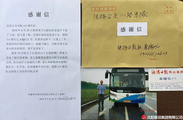 8月20日下午,沈陽突降大雨,鑫暢巴士v111路駕駛員吳堃駕駛公交車駛至莫子山公園附近時,看到一位老人在路邊徘徊,全身已被雨水澆透。雖然老人沒有在站點位置等車,但吳堃見老人狀態(tài)不佳,于是將車??吭诼愤?。走近后見老人臉色慘白,嘴唇已經(jīng)沒了血色,便關(guān)切地詢問道,老人稱自己迷了路,找不到回家的方向了。于是吳堃第一時間將老人帶回了車隊,找來干毛巾把老人身上的雨水擦干,喝了熱水后老人逐漸緩了過來。原來,老人姓欒,家住五愛街,到莫子山公園游玩,突然下起了雨,他趕緊往山下跑,卻因新修路不熟悉路形而迷失了方向。