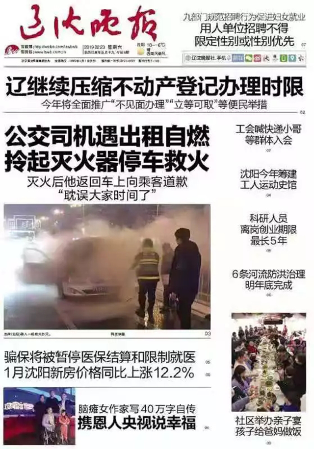 遼沈晚報(bào)得知此事之后對(duì)當(dāng)事人和車隊(duì)進(jìn)行了采訪宣傳報(bào)道?!翱赡芫褪浅鲎廛嚲€路老化引起的,我車上的滅火器容量是 4 公斤的,比私家車上的滅火器容量大,上去一噴就見效果。公司每年都組織兩次消防實(shí)戰(zhàn)演練,所以面對(duì)自燃等突發(fā)狀況,有信心對(duì)付?!壁w林對(duì)記者說道。