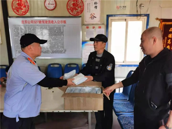 5月1日一早,王大爺帶著一箱口罩來(lái)到了沈蘇公司327車隊(duì)。