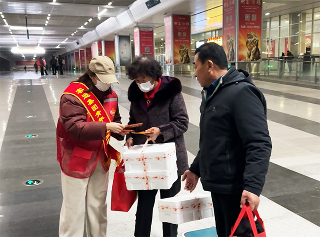 活動(dòng)中,團(tuán)員青年及志愿者在沈陽南站出站口、地鐵口及公交樞紐站服務(wù)臺(tái)向廣大乘客發(fā)放“沈陽最美網(wǎng)紅打卡地圖”DM傳單及暖寶寶。