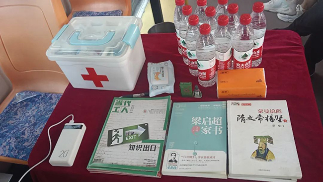 車身懸掛著“以夢為馬,不負韶華,中考砥礪前行”“九年寒窗,在此一搏,沖刺中考,奮斗今朝”等祝福條幅,車廂內,飲用水、充電寶、文具、應急藥物、雨傘、紙巾以及書籍應有盡有。不一會兒,車內就坐了不少家長,對此,家長們很是感動,感謝車隊和王師傅提供的休息場所。