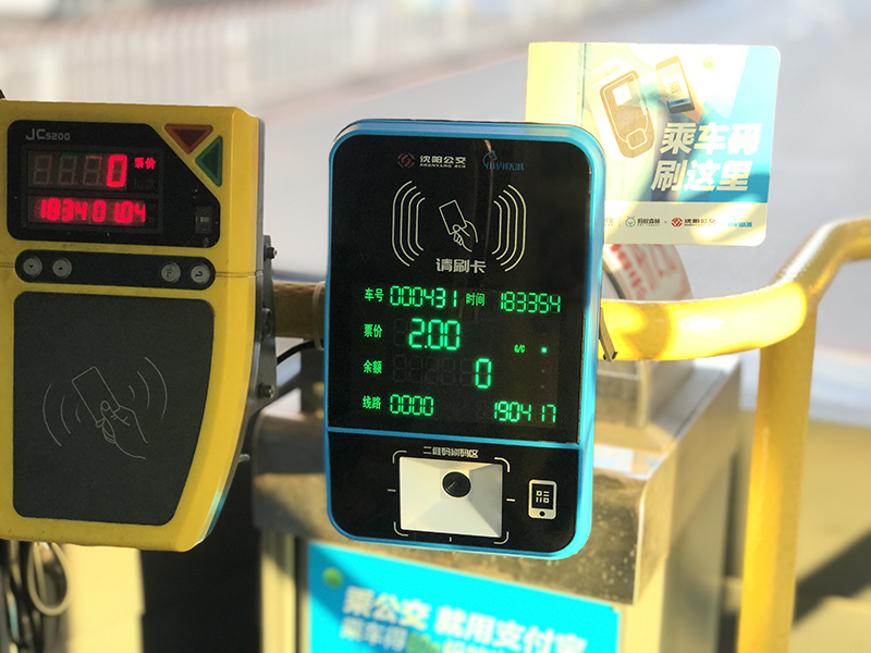 在公交車上安裝有兩臺刷卡機的線路,其中藍色的一臺刷卡機就是支持移動支付的刷卡機。
